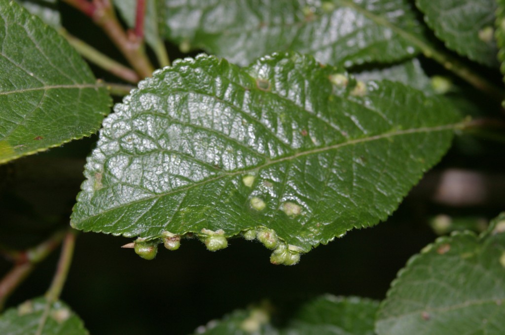 Galls of the mite (Eriophyes similis) alomg the edge of Blackthorn (Prunus spinosa) leaves