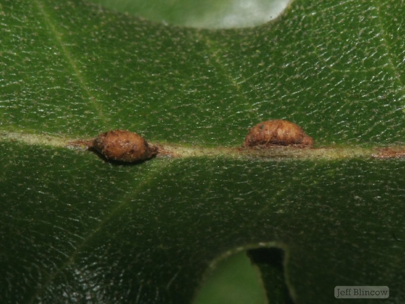 Old galls of Neuroterus saliens on the top-side mid-rib of a Turkey Oak (Quercus cerris) leaf